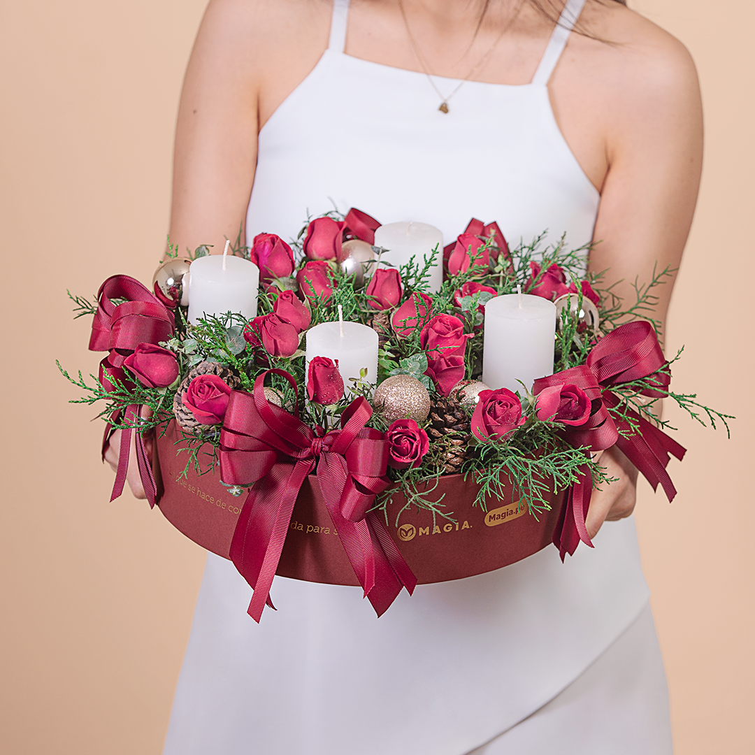 Compuesto por un mix de rosas rojas y mini rosas, acompañado de piñas naturales, esferas navideñas en tonos dorados y guinda, y follajes de temporada que aportan textura y volumen, crea una composición equilibrada y festiva.