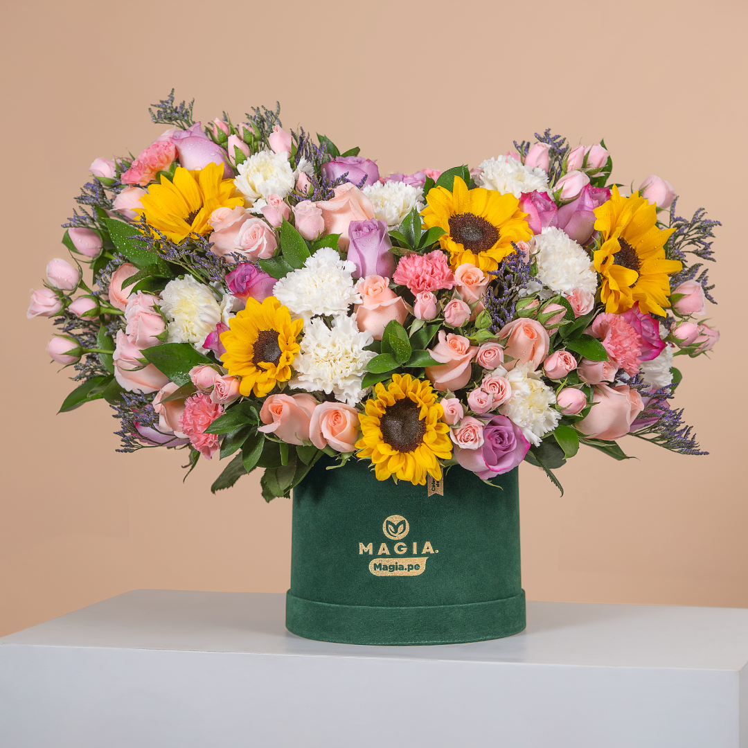 Este arreglo floral de lujo reúne 70 flores super premium, cuidadosamente seleccionadas entre rosas melón, rosas lilas, claveles blancos y rosados y girasoles vibrantes, logrando una composición de color y textura que irradia elegancia, alegría y distinción.