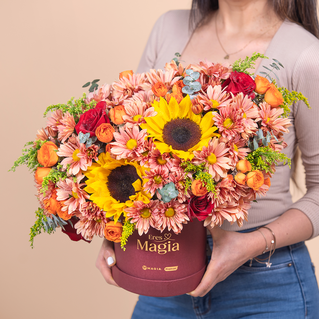 Diseñado artesanalmente por nuestros artistas florales, este arreglo es ideal para regalar alegría, luz y color en momentos especiales, transmitiendo la calidez y energía de la temporada.