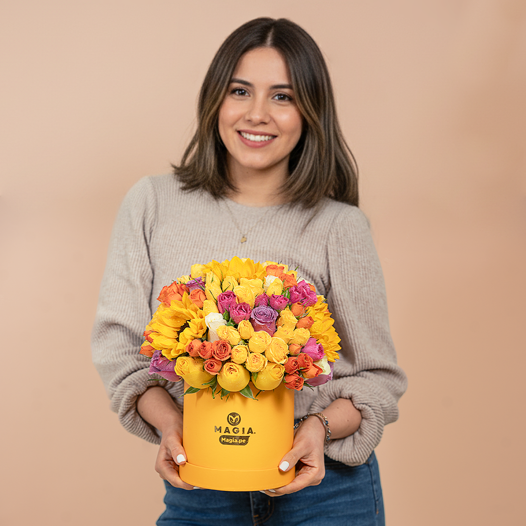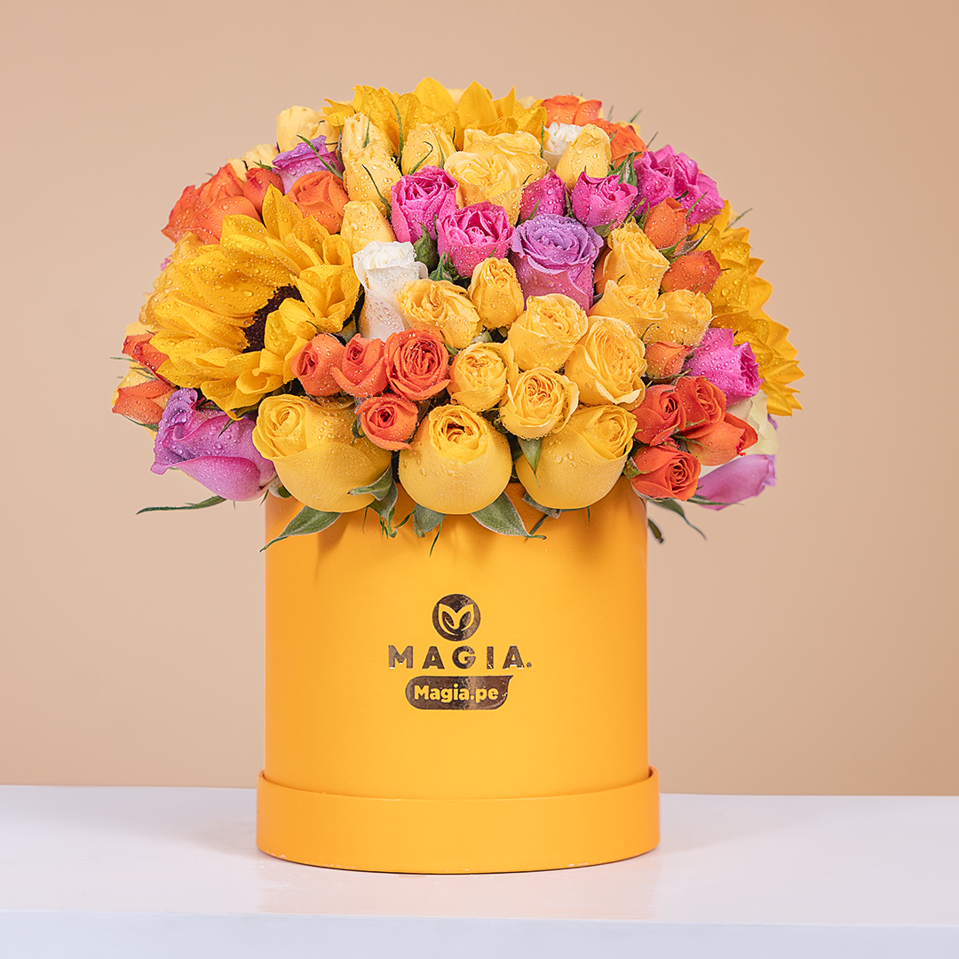 Presentado en un box amarillo de acabado elegante, este arreglo irradia alegría, energía y luminosidad, evocando el estilo distintivo de Magia.pe®.